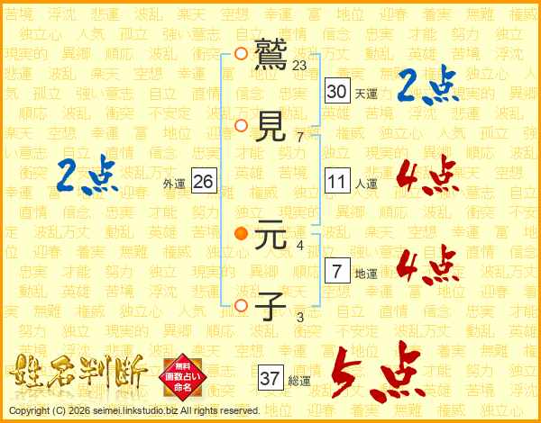 鷲(23画)見(7画) 元(4画)子(3画)