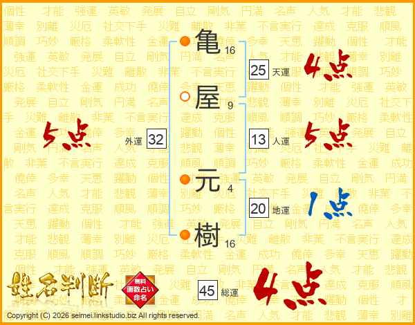 亀屋元樹さんの総運は45画の4点!