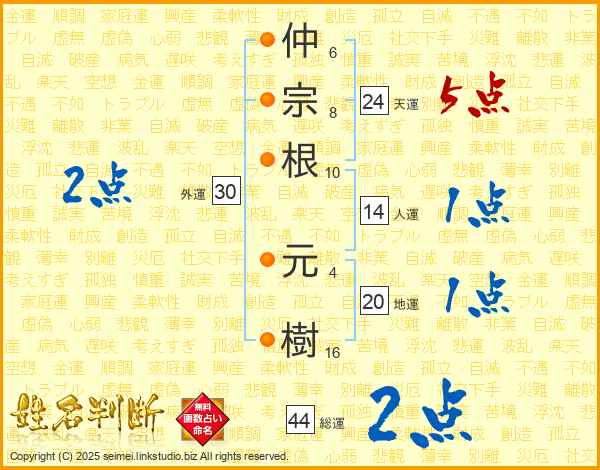 仲(6画)宗(8画)根(10画) 元(4画)樹(16画)