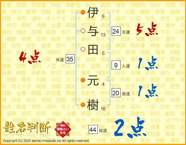 伊(6画)与(13画)田(5画) 元(4画)樹(16画)