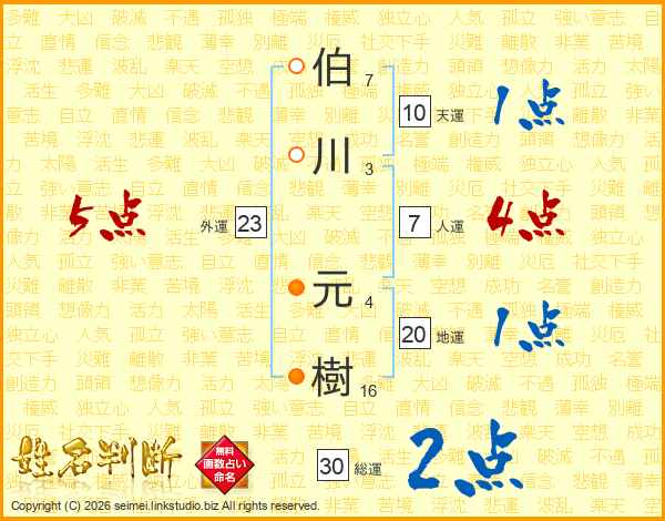 あなたの人生を表す1番重要な運勢です。生涯を通じて影響する総合運となり、主に50歳以降の晩年期に影響を及ぼします。苗字と名前の合計画数。