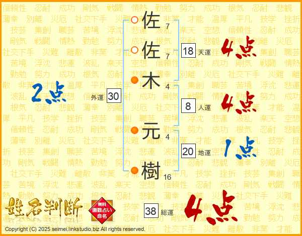 佐佐木元樹さんの総運は38画の4点!