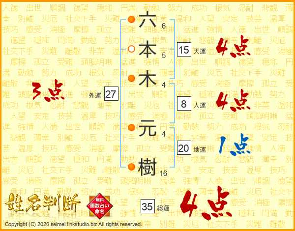 六(6画)本(5画)木(4画) 元(4画)樹(16画)