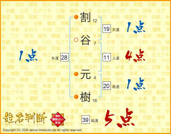 割谷元樹さんの総運は39画の5点!