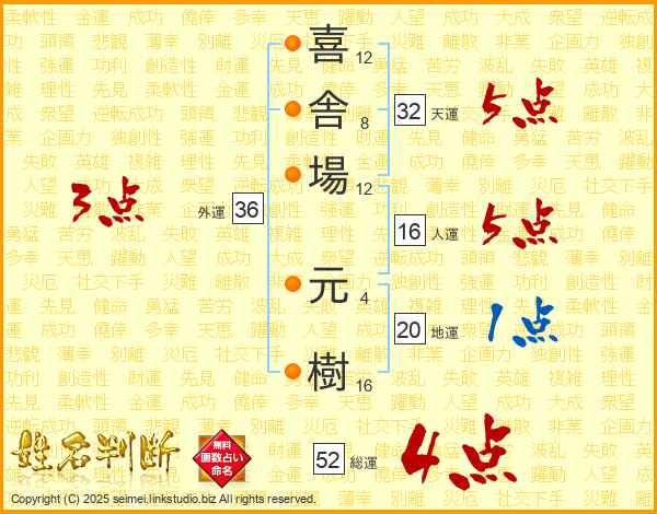 喜(12画)舎(8画)場(12画) 元(4画)樹(16画)