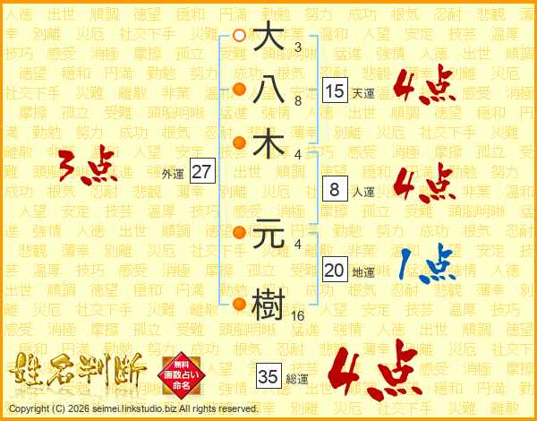 大(3画)八(8画)木(4画) 元(4画)樹(16画)