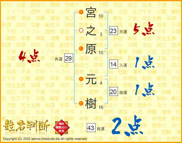 宮(10画)之(3画)原(10画) 元(4画)樹(16画)