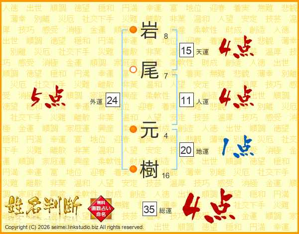 岩(8画)尾(7画) 元(4画)樹(16画)