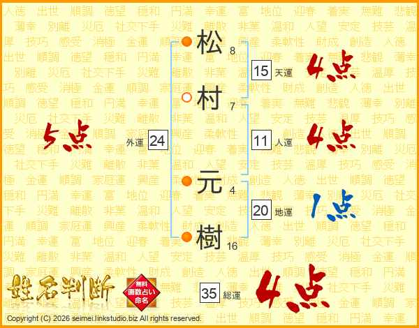 あなたの人生を表す1番重要な運勢です。生涯を通じて影響する総合運となり、主に50歳以降の晩年期に影響を及ぼします。苗字と名前の合計画数。