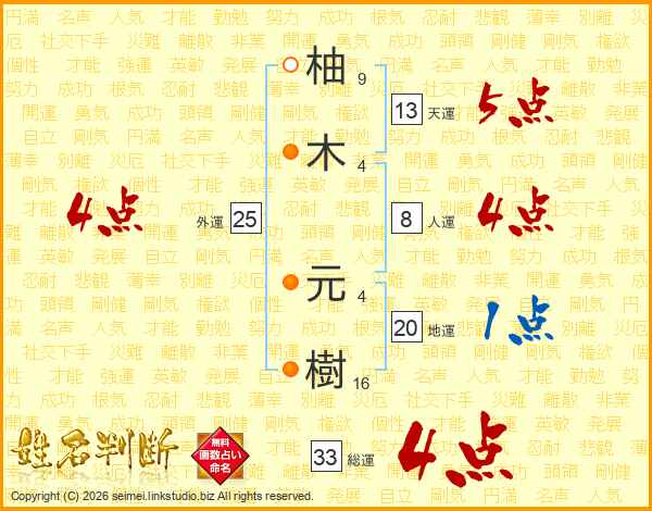 柚(9画)木(4画) 元(4画)樹(16画)