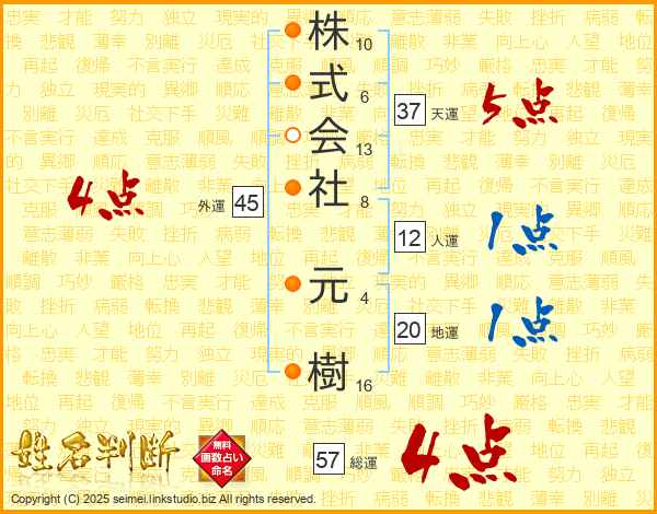 株(10画)式(6画)会(13画)社(8画) 元(4画)樹(16画)