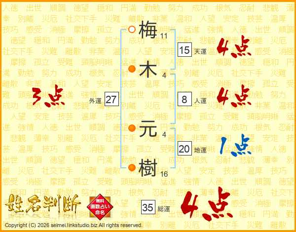 梅(11画)木(4画) 元(4画)樹(16画)