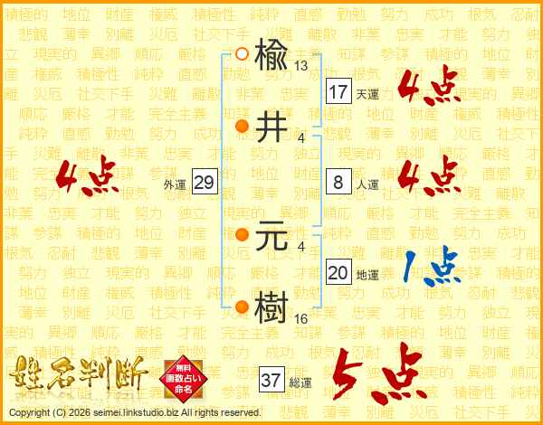 楡井元樹さんの総運は37画の5点!