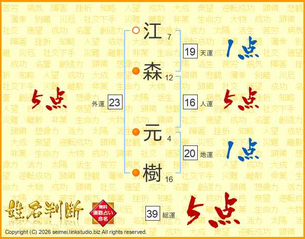 あなたの人生を表す1番重要な運勢です。生涯を通じて影響する総合運となり、主に50歳以降の晩年期に影響を及ぼします。苗字と名前の合計画数。