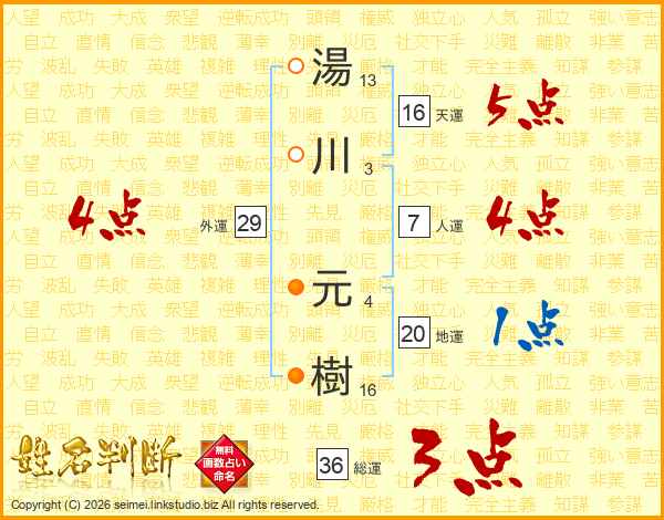 生活面を象徴する運勢です。外部から受ける影響力を表し、結婚運、家庭運や職場、環境への順応性を表します。総運から人運を引いた画数。姓や名が1文字の場合を除く。