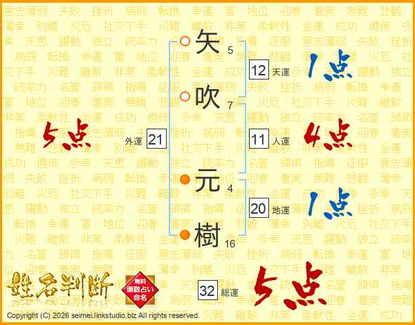 矢吹元樹さんの総運は32画の5点!