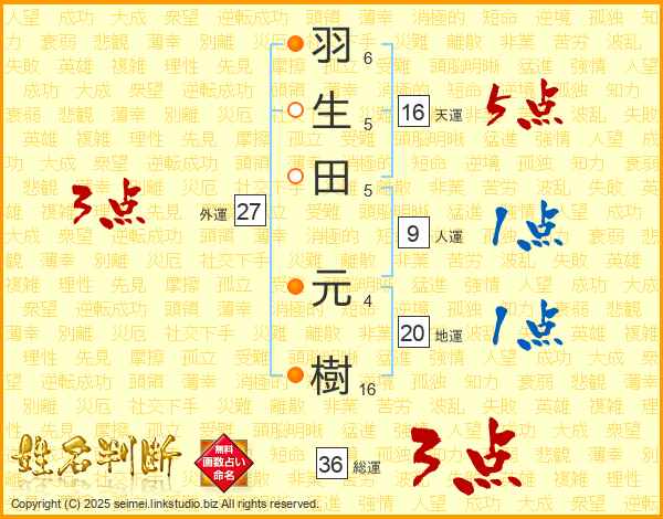 羽生田元樹さんの総運は36画の3点!