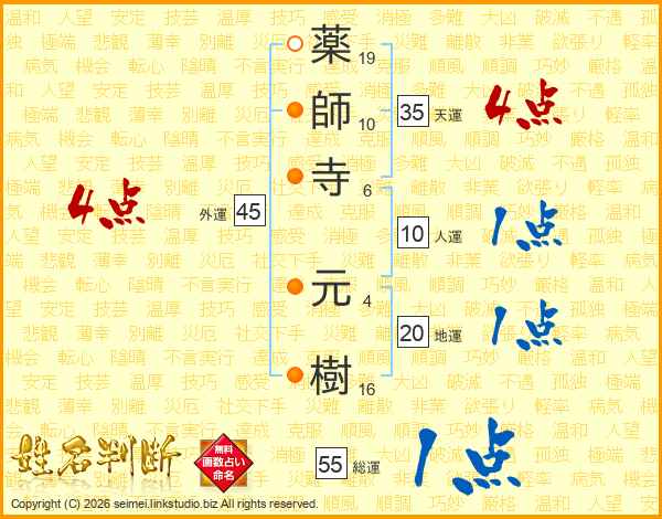 薬(19画)師(10画)寺(6画) 元(4画)樹(16画)