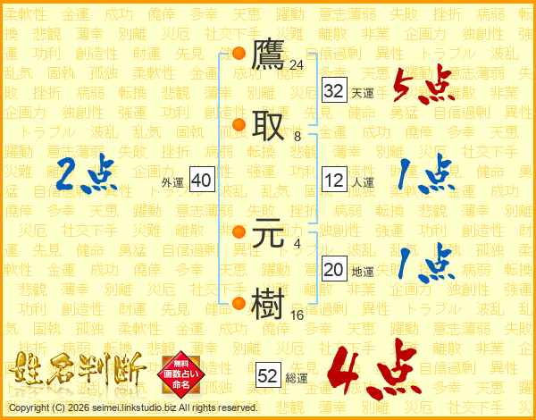 鷹(24画)取(8画) 元(4画)樹(16画)