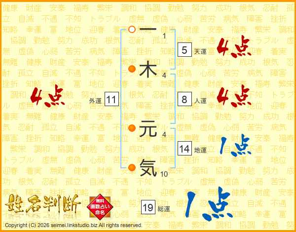 生活面を象徴する運勢です。外部から受ける影響力を表し、結婚運、家庭運や職場、環境への順応性を表します。総運から人運を引いた画数。姓や名が1文字の場合を除く。