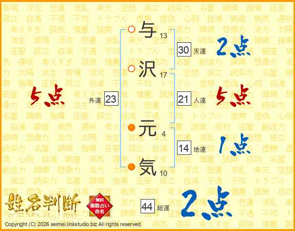 生活面を象徴する運勢です。外部から受ける影響力を表し、結婚運、家庭運や職場、環境への順応性を表します。総運から人運を引いた画数。姓や名が1文字の場合を除く。