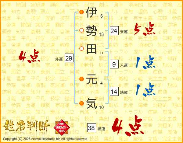 伊(6画)勢(13画)田(5画) 元(4画)気(10画)
