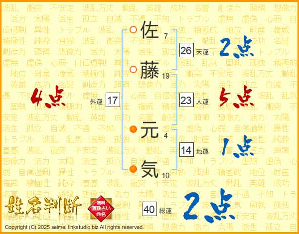 生活面を象徴する運勢です。外部から受ける影響力を表し、結婚運、家庭運や職場、環境への順応性を表します。総運から人運を引いた画数。姓や名が1文字の場合を除く。