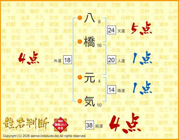 生活面を象徴する運勢です。外部から受ける影響力を表し、結婚運、家庭運や職場、環境への順応性を表します。総運から人運を引いた画数。姓や名が1文字の場合を除く。