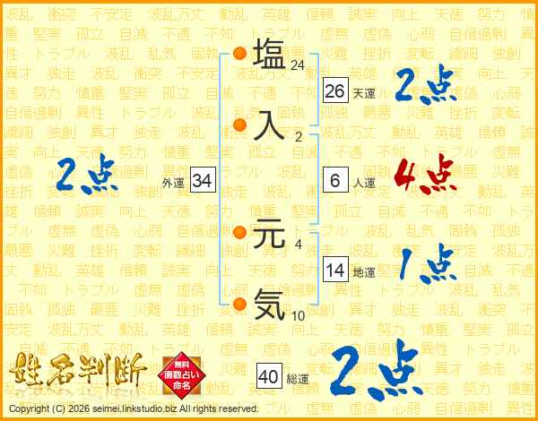 生活面を象徴する運勢です。外部から受ける影響力を表し、結婚運、家庭運や職場、環境への順応性を表します。総運から人運を引いた画数。姓や名が1文字の場合を除く。