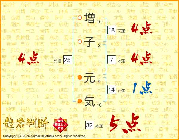 生活面を象徴する運勢です。外部から受ける影響力を表し、結婚運、家庭運や職場、環境への順応性を表します。総運から人運を引いた画数。姓や名が1文字の場合を除く。