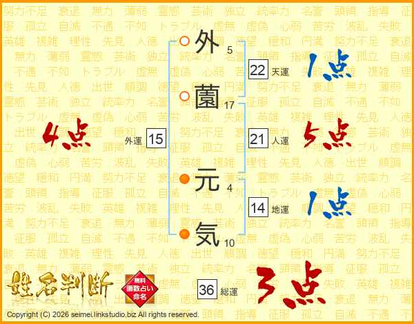 生活面を象徴する運勢です。外部から受ける影響力を表し、結婚運、家庭運や職場、環境への順応性を表します。総運から人運を引いた画数。姓や名が1文字の場合を除く。
