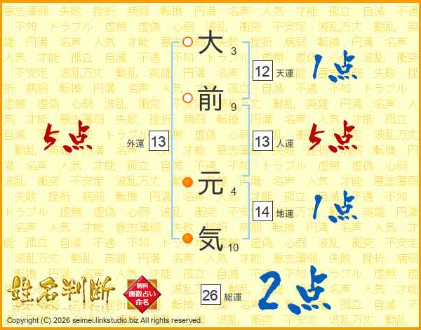 生活面を象徴する運勢です。外部から受ける影響力を表し、結婚運、家庭運や職場、環境への順応性を表します。総運から人運を引いた画数。姓や名が1文字の場合を除く。