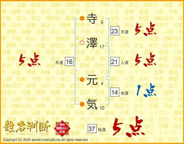 生活面を象徴する運勢です。外部から受ける影響力を表し、結婚運、家庭運や職場、環境への順応性を表します。総運から人運を引いた画数。姓や名が1文字の場合を除く。