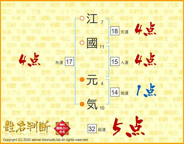 生活面を象徴する運勢です。外部から受ける影響力を表し、結婚運、家庭運や職場、環境への順応性を表します。総運から人運を引いた画数。姓や名が1文字の場合を除く。