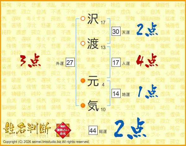 沢(17画)渡(13画) 元(4画)気(10画)