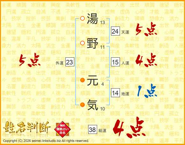 湯野元気さんの総運は38画の4点!