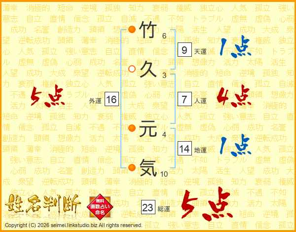 竹久元気さんの総運は23画の5点!