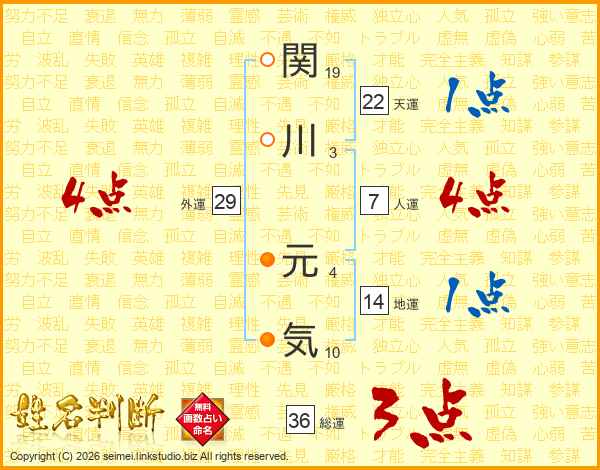 生活面を象徴する運勢です。外部から受ける影響力を表し、結婚運、家庭運や職場、環境への順応性を表します。総運から人運を引いた画数。姓や名が1文字の場合を除く。