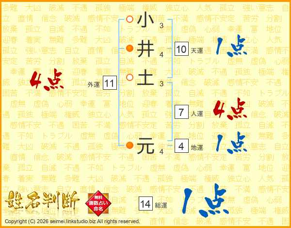 生活面を象徴する運勢です。外部から受ける影響力を表し、結婚運、家庭運や職場、環境への順応性を表します。総運から人運を引いた画数。姓や名が1文字の場合を除く。
