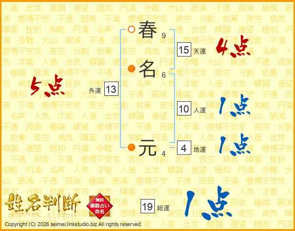 生活面を象徴する運勢です。外部から受ける影響力を表し、結婚運、家庭運や職場、環境への順応性を表します。総運から人運を引いた画数。姓や名が1文字の場合を除く。