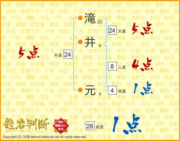 家系が持つ宿命的な運勢を表します。祖先から受け継いだ苗字ですので自分の力が及びません。家柄を象徴します。苗字の合計画数。