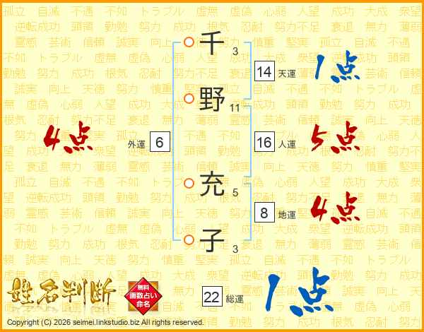 生活面を象徴する運勢です。外部から受ける影響力を表し、結婚運、家庭運や職場、環境への順応性を表します。総運から人運を引いた画数。姓や名が1文字の場合を除く。