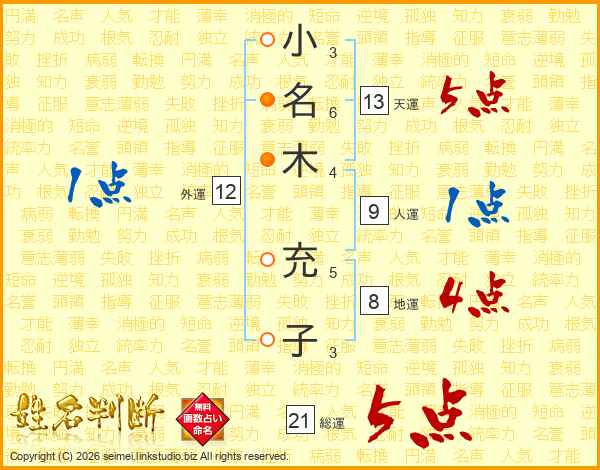 小名木充子さんの総運は21画の5点!