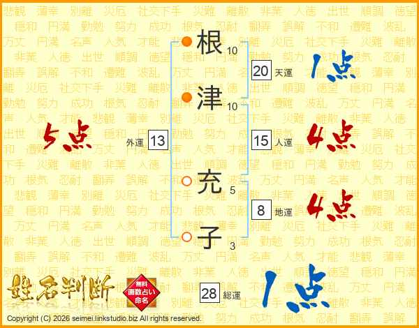 生活面を象徴する運勢です。外部から受ける影響力を表し、結婚運、家庭運や職場、環境への順応性を表します。総運から人運を引いた画数。姓や名が1文字の場合を除く。