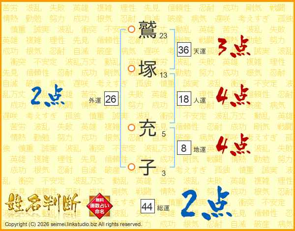 鷲(23画)塚(13画) 充(5画)子(3画)