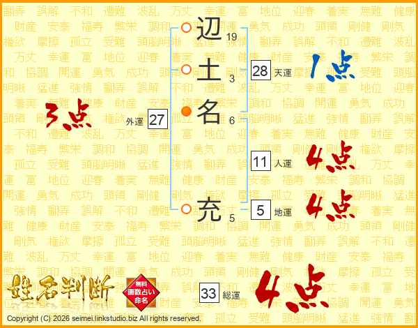 生活面を象徴する運勢です。外部から受ける影響力を表し、結婚運、家庭運や職場、環境への順応性を表します。総運から人運を引いた画数。姓や名が1文字の場合を除く。