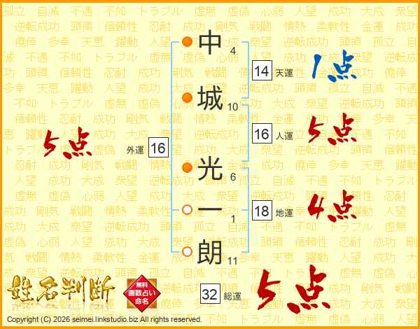 中(4画)城(10画) 光(6画)一(1画)朗(11画)