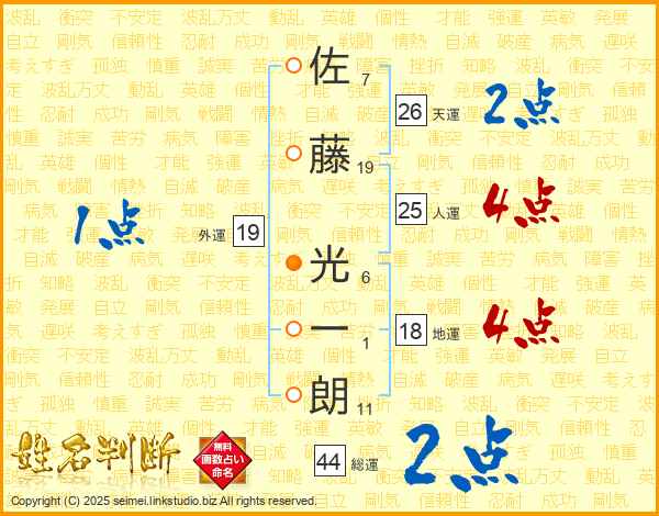 佐(7画)藤(19画) 光(6画)一(1画)朗(11画)