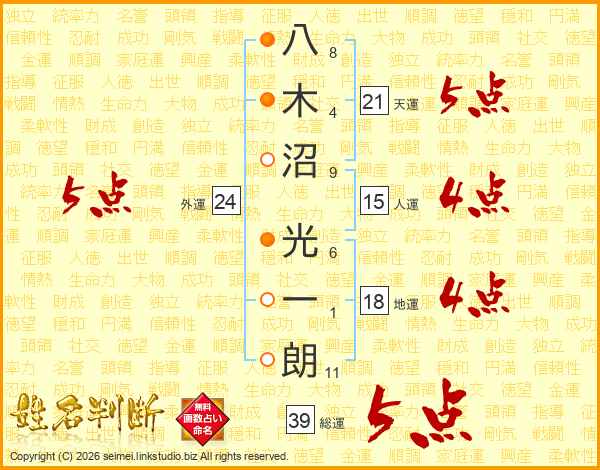 八木沼光一朗さんの総運は39画の5点!