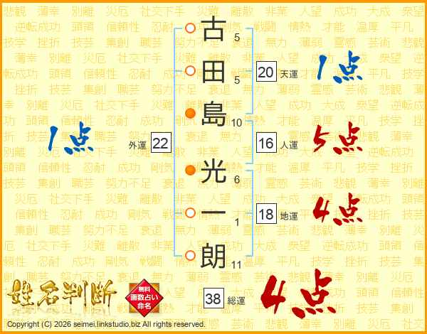 古(5画)田(5画)島(10画) 光(6画)一(1画)朗(11画)